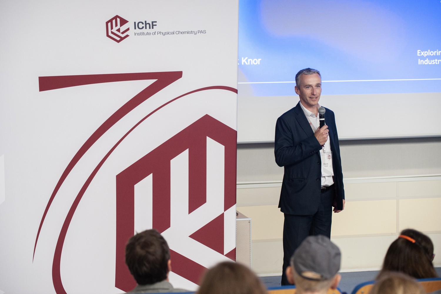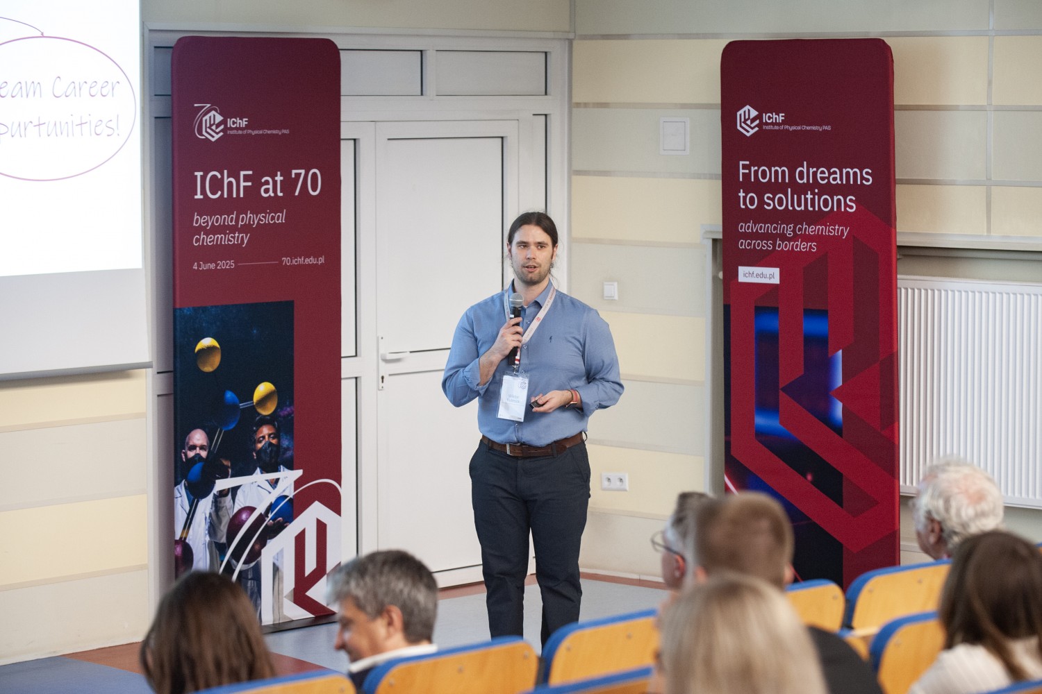 The next part of the program was devoted to reflections on the development of scientific careers at IChF. The session, chaired by Prof. Agnieszka Michota-Kamińska, was opened by Wiktor Kulesza, chairman of the Council of Doctoral Students, presenting a perspective of those beginning their scientific work at the Institute. Prof. Aleksei Aksimentiev recounted how doctoral studies at the Institute influenced his scientific path from research on the basic components of matter to contemporary issues of biophysics and virology. Institute alumnus Dr. Marek Knor spoke about the importance of physical chemistry in industry, while Prof. Gonzalo Angulo presented a personal story about his scientific journey from Andalusia to Warsaw.