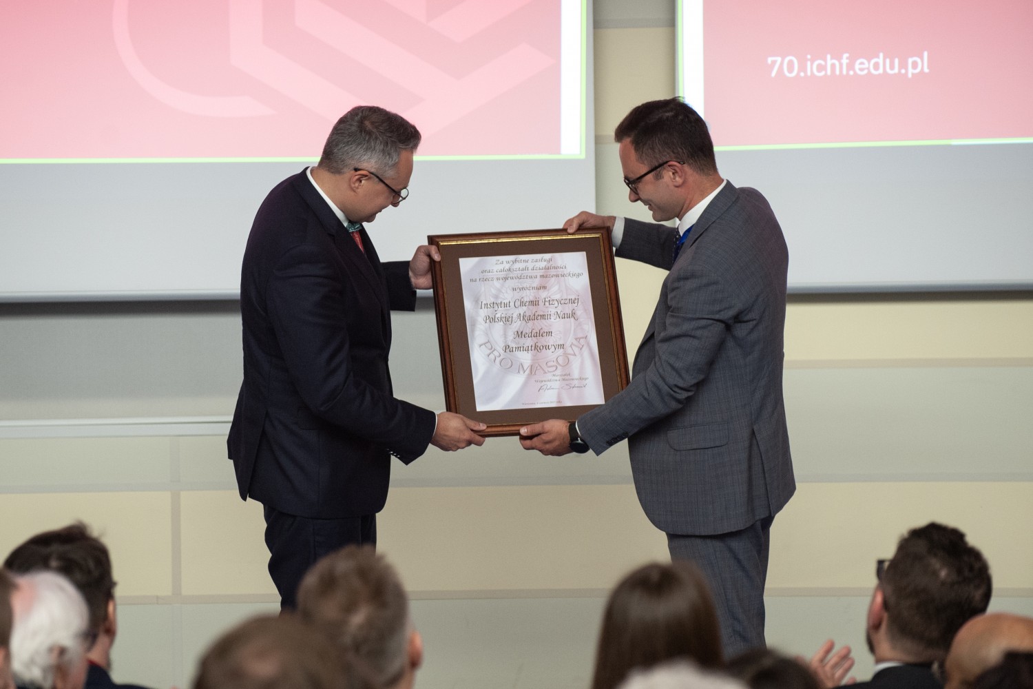Director Adam Kubas received the "Pro Masovia" medal from a representative of the Masovian Voivodeship and a diploma of recognition issued by the Marshal of the Masovian Voivodeship, Adam Struzik. The speaker emphasized that it is thanks to institutes such as IChF that the Masovian region has achieved the status as a leader in innovation and scientific research in Poland, concentrating over one third of the national R&D potential and generating over 20% of GDP.