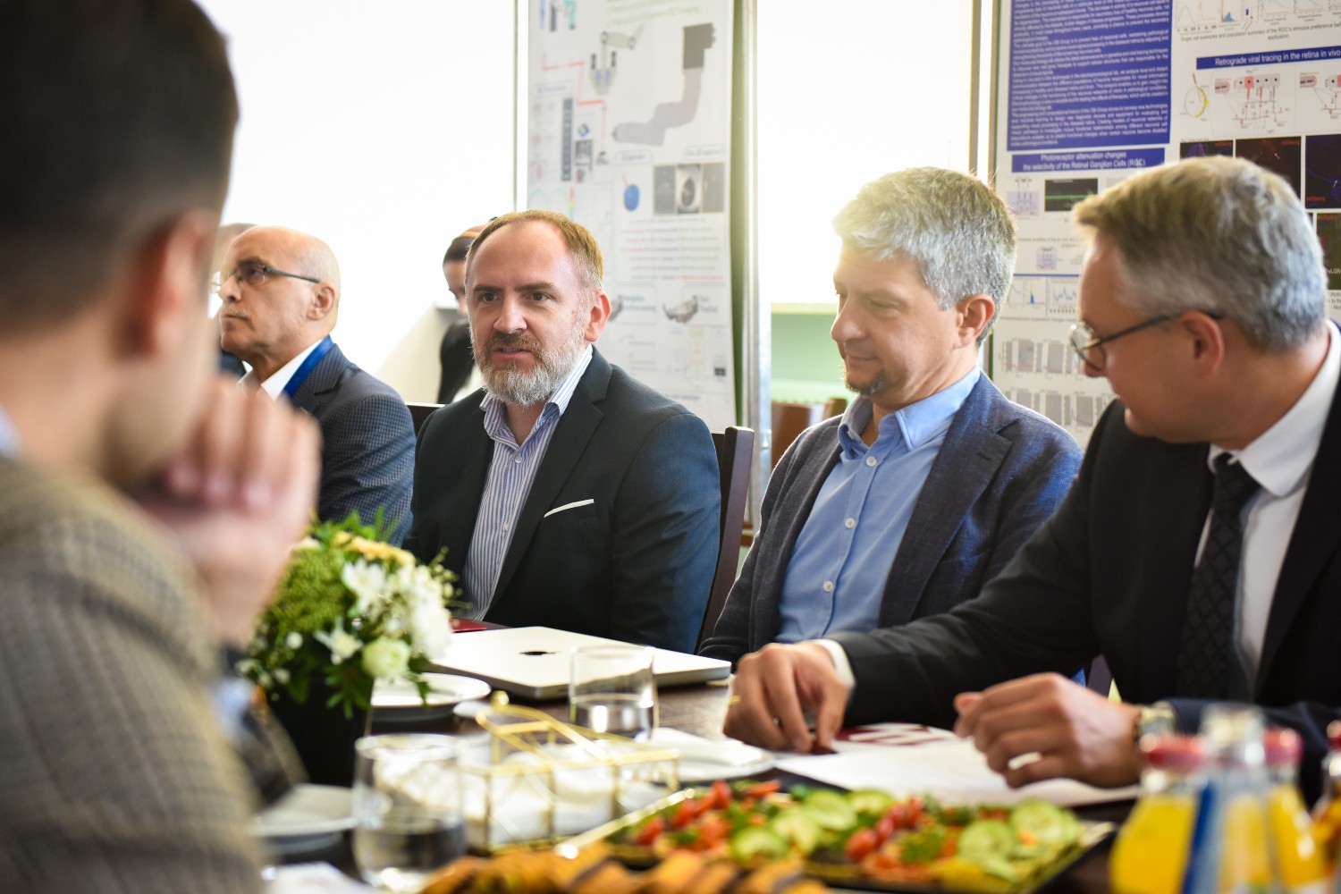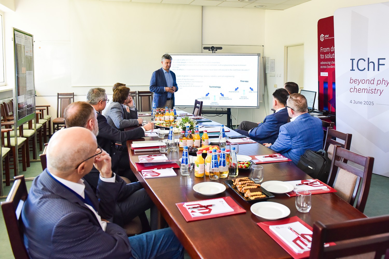 On September 22, 2025, the Institute of Physical Chemistry, Polish Academy of Sciences (IPC PAS) in Warsaw hosted a meeting dedicated to “The potential of the Mazovia Region in the development of gene therapies.” The discussion brought together representatives of the regional government, the clinical community, and research teams from IPC PAS and ICTER – the International Centre for Translational Eye Research. Participants included Adam Struzik, Marshal of the Mazowieckie Voivodeship, Marcin Wajda (Director of the Department of Regional Development and European Funds), Prof. Mirosław Ząbek (Neurosurgery Clinic, Mazovian Bródno Hospital), and—on behalf of IPC PAS and ICTER—Prof. Maciej Wojtkowski, Dr. Andrzej Foik, Dr. Karol Karnowski, Prof. Jan Guzowski, Prof. Adam Kubas, Director of IPC PAS, and Prof. Jacek Gregorowicz, Deputy Director of IPC PAS. Each institution presented a brief overview of its achievements and research plans, and the Marshal was interviewed by the IPC PAS Communication Manager on Mazovia’s role in advancing gene therapies.