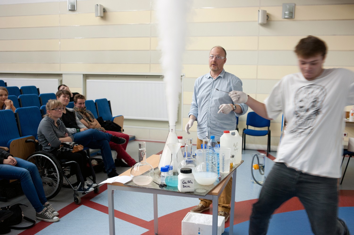 Ponad godzinna lekcja była dynamiczną opowieścią o stanach skupienia – bez slajdów, za to z licznymi, bezpiecznymi pokazami wykonywanymi wspólnie z uczniami. Uczestnicy siedzieli blisko stanowiska pokazowego, by widzieć każdy detal i… wziąć udział w doświadczeniach.