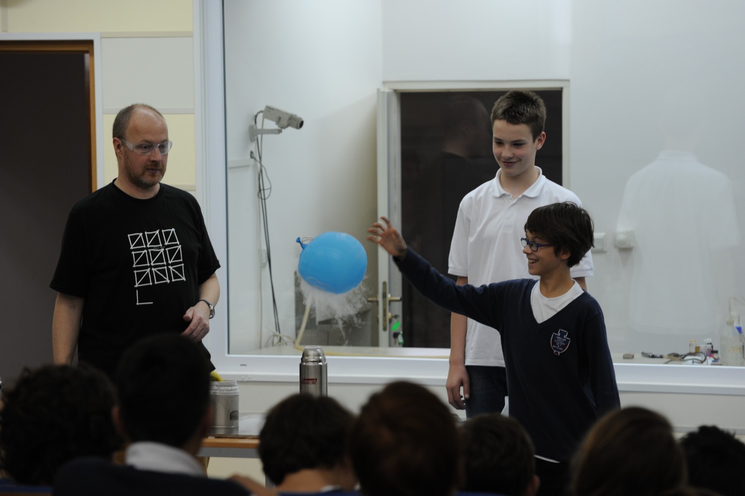 Lekcja obfitowała w interaktywne eksperymenty – od nadmuchiwania balonika w próżni i mrożenia go ciekłym azotem, przez wbijanie gwoździa zamrożonym bananem, aż po zabawne „mówienie po helu”. Uczniowie poznali przy tym różnicę między teorią naukową a potoczną, dowiedzieli się, dlaczego ciekły azot pozwala skroplić tlen (z krótkim wprowadzeniem historycznym o pionierach skraplania gazów – Zygmuncie Wróblewskim i Karolu Olszewskim), zrozumieli działanie pH i barwnych wskaźników oraz zasady łączenia atrakcyjności doświadczeń z bezpieczeństwem.