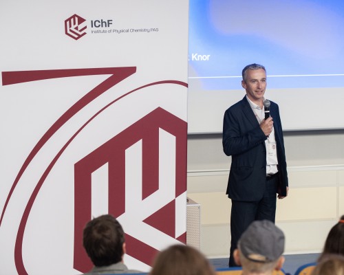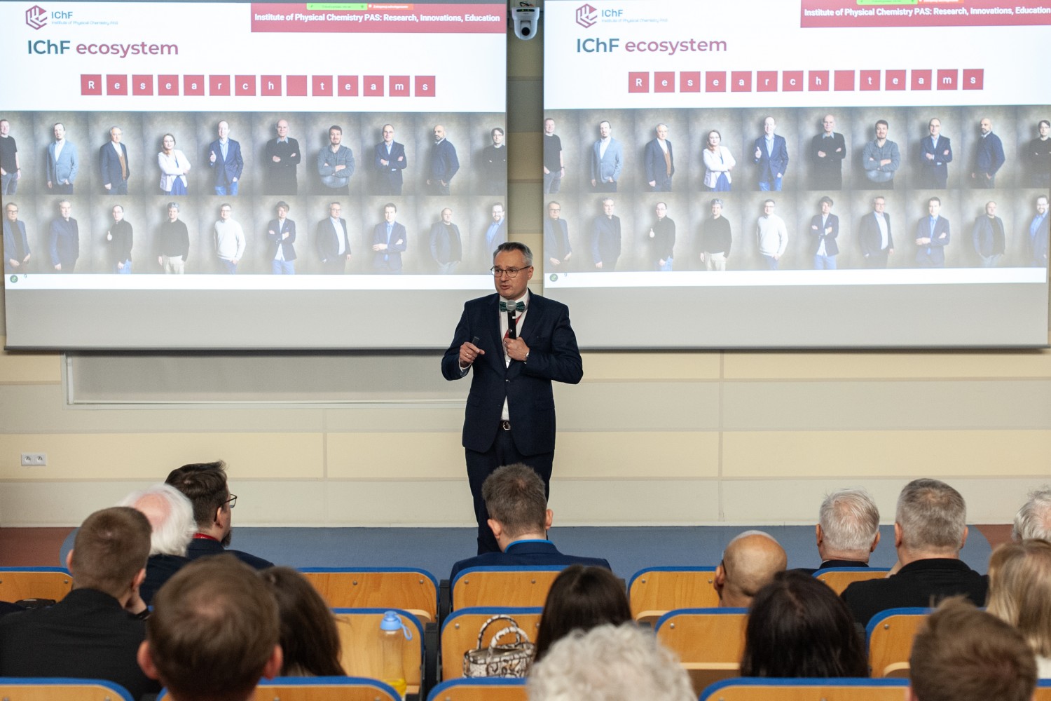 Prof. Marcin Opałło podsumował siedemdziesięcioletnią historię Instytutu w wykładzie „70 years of IChF in a nutshell”. Następnie dyrektor Adam Kubas, w prezentacji „IChF Today and Tomorrow”, nakreślił bieżące wyzwania, cele strategiczne oraz rolę, jaką Instytut pełni obecnie w krajowym i międzynarodowym systemie nauki. Przedstawił również aktualną strukturę jednostki oraz wizję jej dalszego rozwoju.