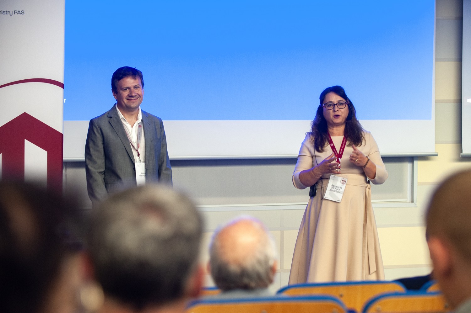Następnie powrócili do auli na trzecią sesję, poświęconą badaniom naukowym. Obradom przewodniczyła prof. Joanna Niedziółka-Jönsson. Prof. Jacek Waluk zaprezentował refleksję opartą na niemal pięciu dekadach własnych doświadczeń w Instytucie. Następnie prof. Stefan Bräse przedstawił wizję rozwoju chemii cyfrowej w wykładzie „Digital chemistry - a trip into the blue”, prof. Elena Ferapontova opowiedziała o zastosowaniu metod elektrochemicznych w diagnostyce nowotworów i zakażeń prezentując „Antimicrobials & Cancer Diagnostics Through an Electrochemical Lens”, zaś prof. Aleksei Aksimentiev zaprezentował nowoczesne podejścia do modelowania złożonych układów biologicznych – „Toward predictive modeling of bimolecular systems, from physical chemistry of polymers to viruses and organelles.”