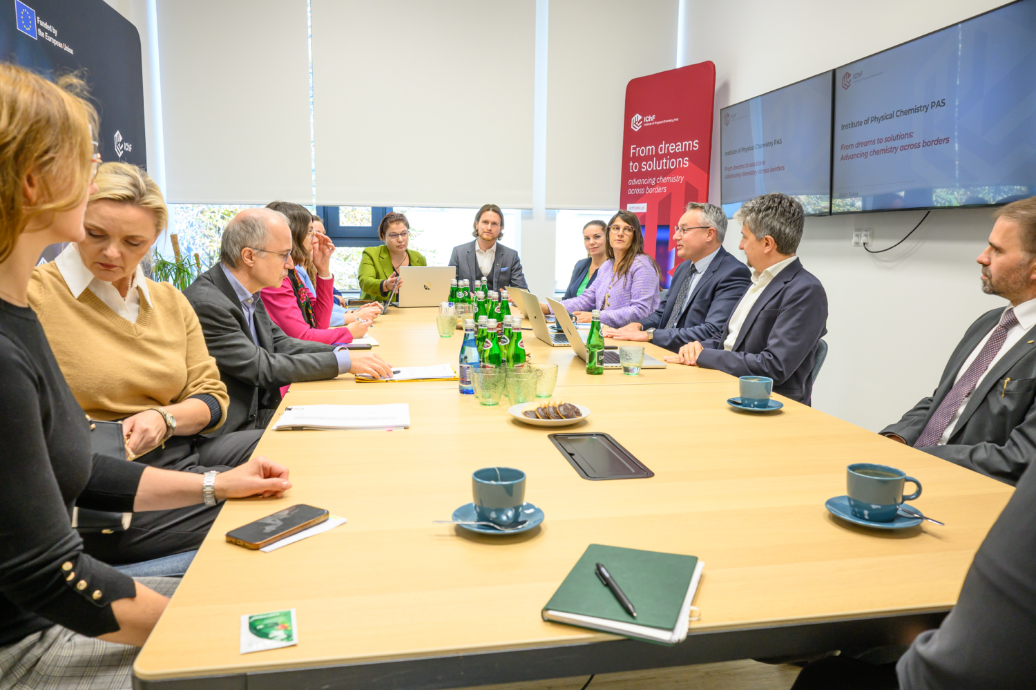 Jak europejskie inwestycje przekładają się na realny wpływ polskiej nauki – o tym rozmawiano 13 października 2025 r. w Instytucie Chemii Fizycznej Polskiej Akademii Nauk (IChF PAN) i Międzynarodowym Centrum Badań Oka (ICTER) podczas spotkania z przedstawicielami Komisji Europejskiej, Ministerstwa Funduszy i Polityki Regionalnej oraz Fundacji na rzecz Nauki Polskiej.