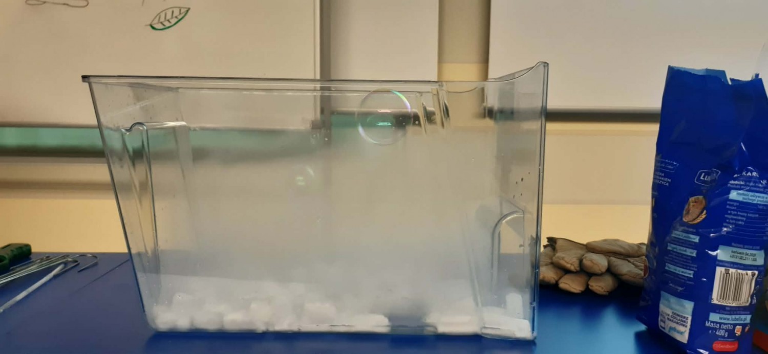 • eksperymenty z suchym lodem, np. czy suchym lodem można napompować balon;