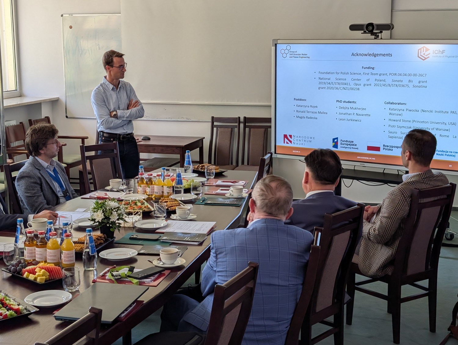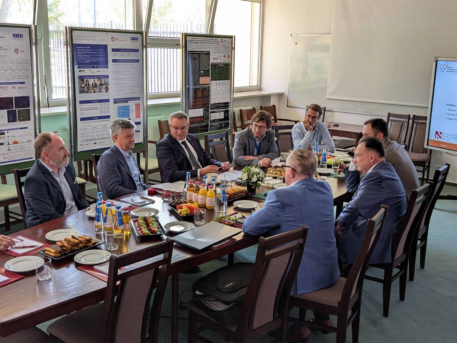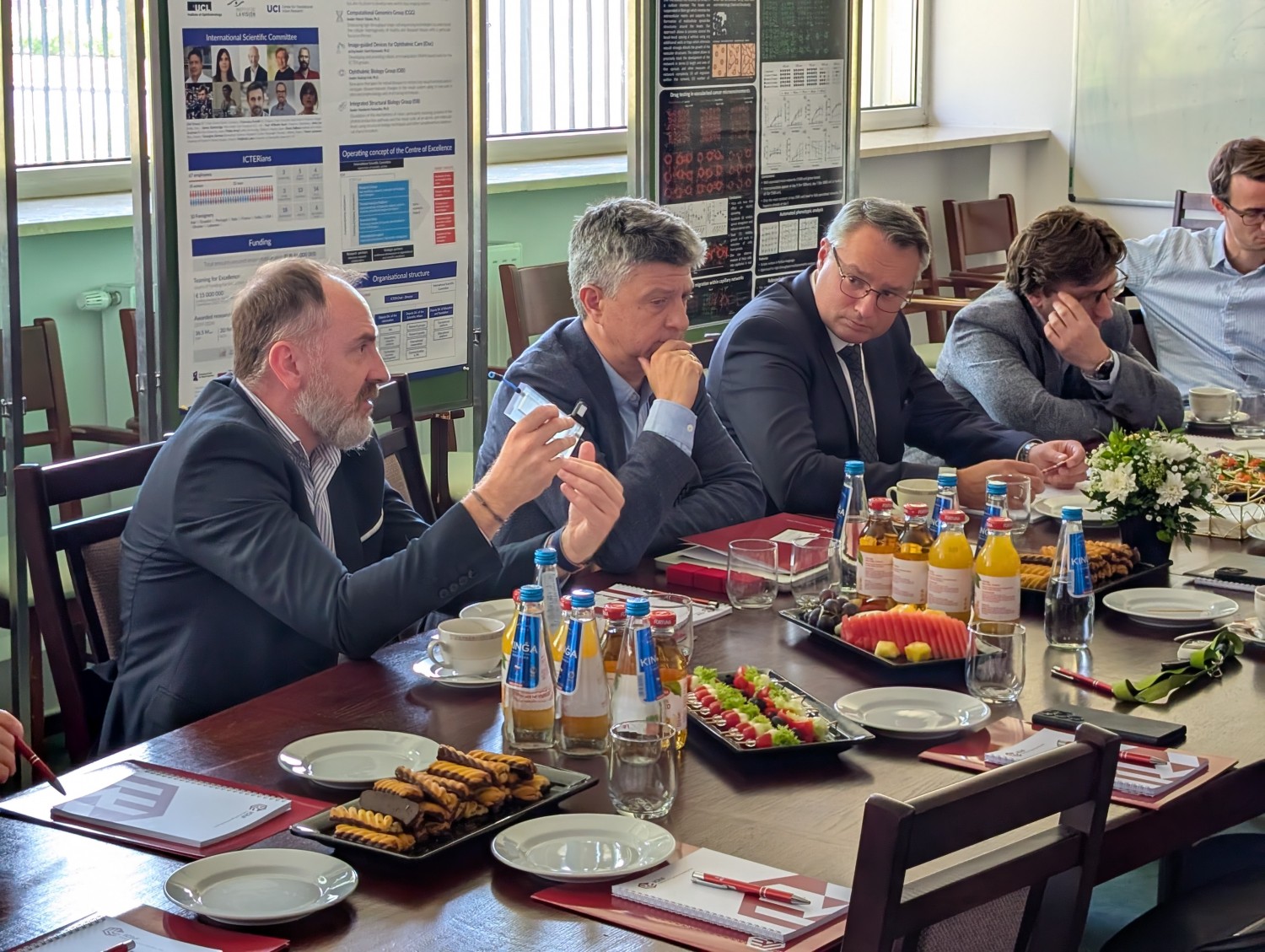 Spotkanie rozpoczęło się od powitania i przedstawienia instytutu przez dyrektora Adama Kubasa. Następnie prof. Maciej Wojtkowski zaprezentował Międzynarodowe Centrum Badań Oka IChF PAN (ICTER).